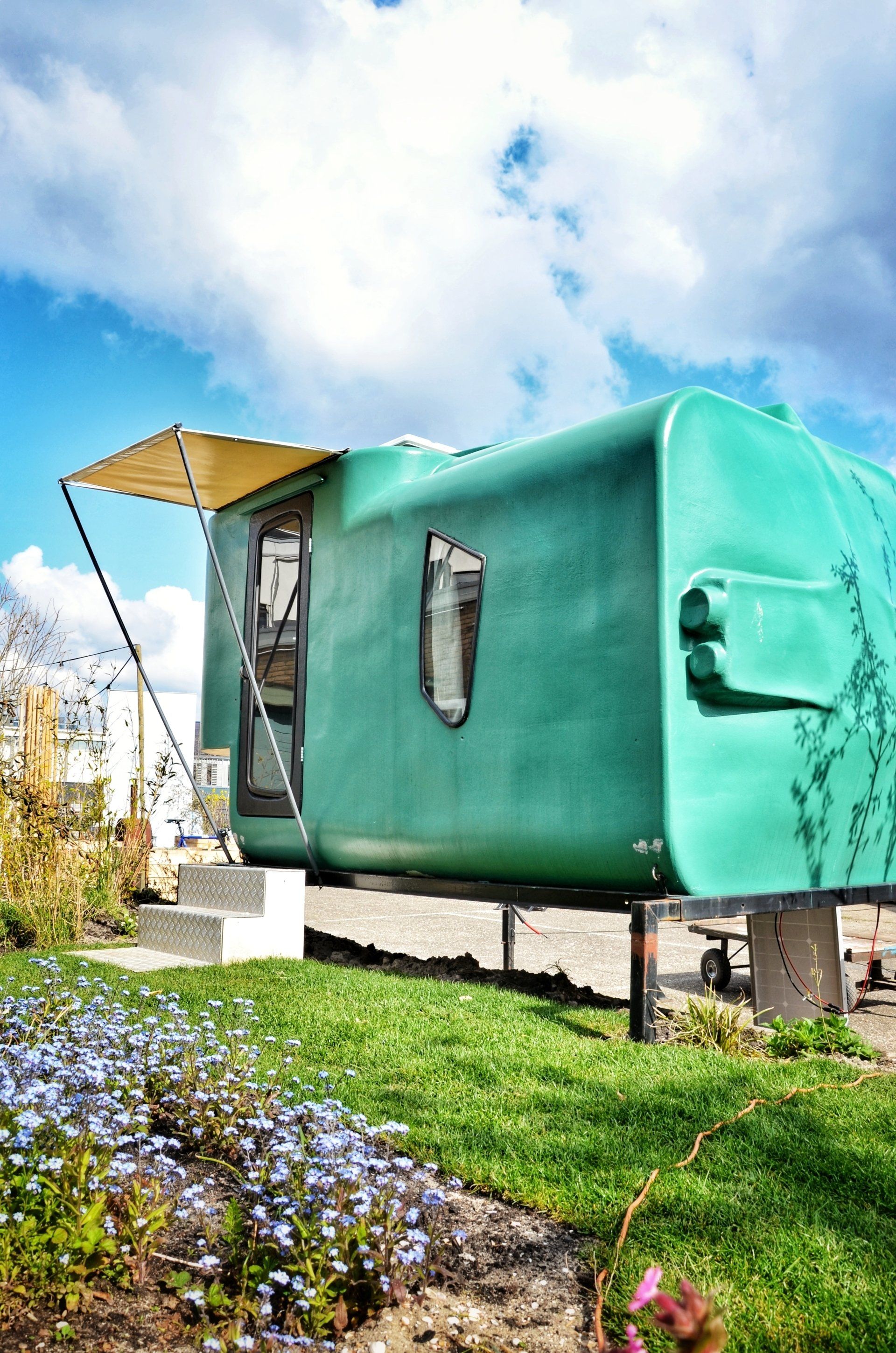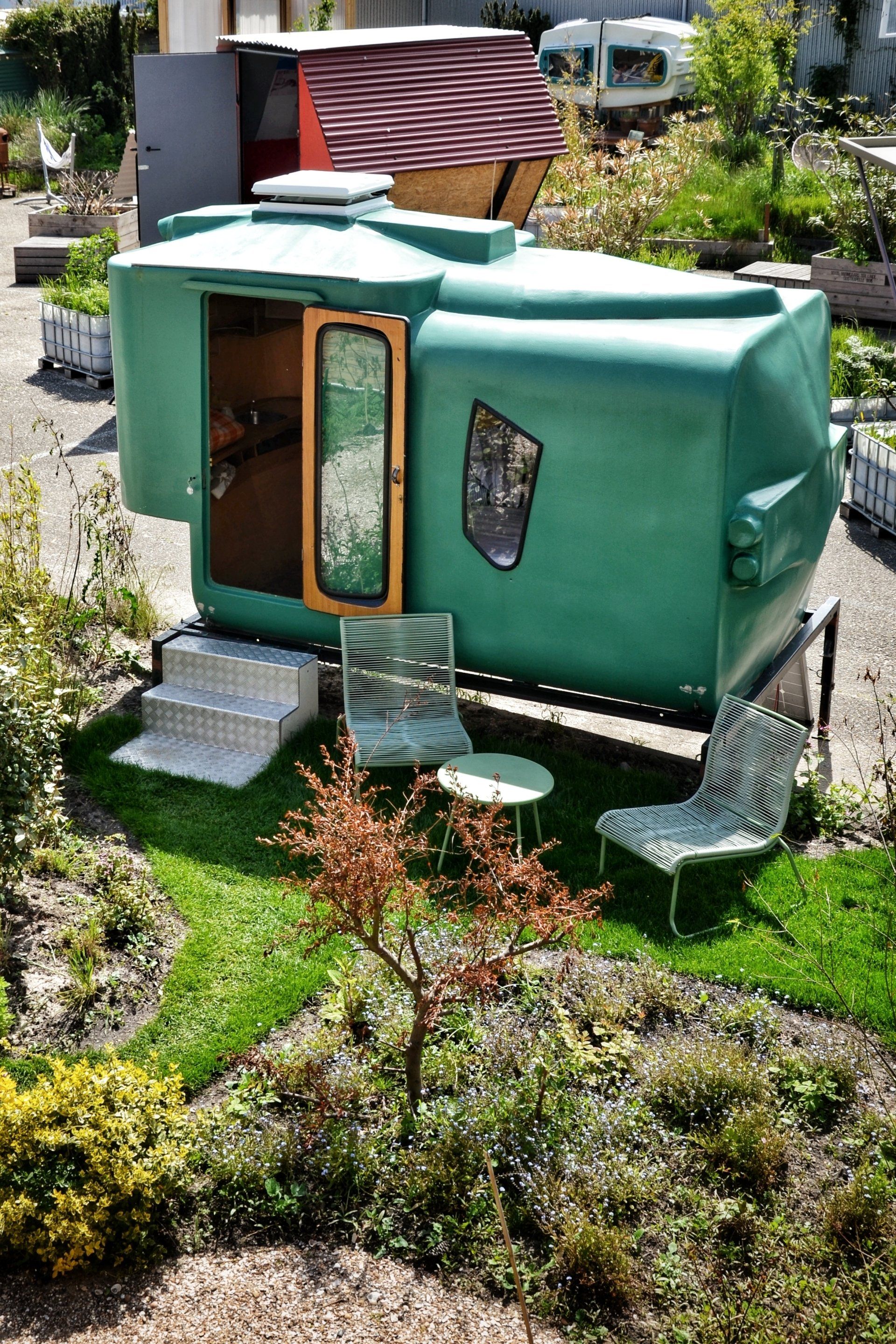 Little Pea is made from discarded animal silos and originally functioned as a mobile tiny house. It is custom designed to fit on a pick-up truck. Different pieces of silo have been joined together to create an original design with a functional space.